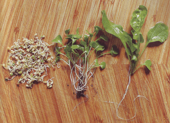 In the photo below, you can see sprouts on the left, microgreens in the middle and a more mature vegetable plant on the right: